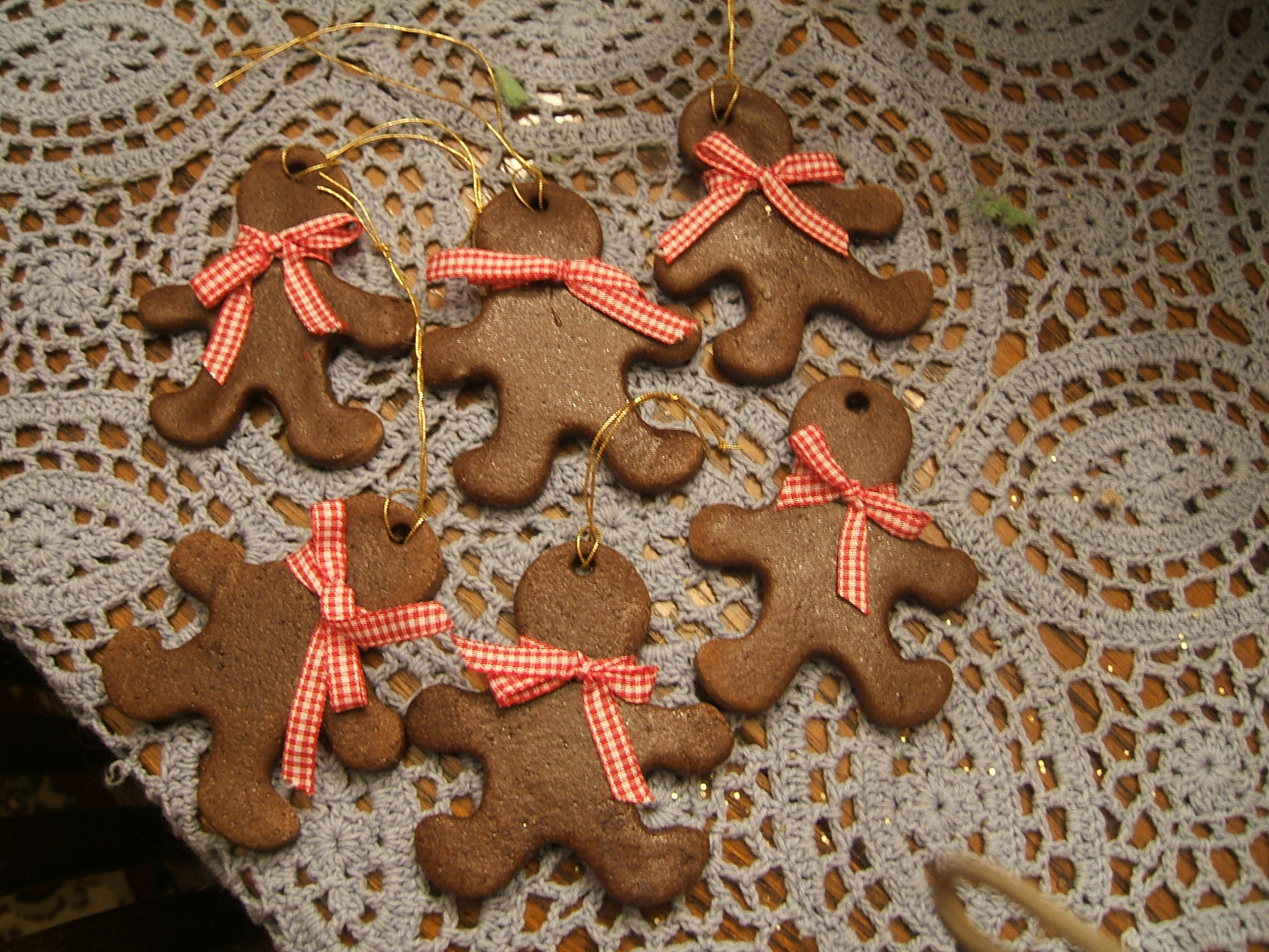 Blend the dry ingredients and then add water. Mix well. Roll out and cut with any cookie cutters you choose. Be sure to cut a hole for hanging. I cut mine with a straw. Makes about 18 small ornaments. You don’t need to bake these, however, air drying can take several days especially if, like me, you’ve made them thicker. I ended up pre-heating my oven to about 200 and put the tray of ornaments inside. I then immediately turned off the oven and I left the tray of ornaments there for several hours while the oven cooled. The ornaments will dry a light color but you can bring back the dark color by coating them with a clear coat. I used a can of Rustoleum spray gloss enamel clear coat. Polyurethane would work too.