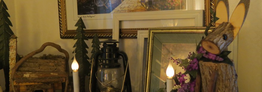 I began my living room make-over by rearranging the furniture. I moved both the sofa and recliner to new positions I’ve never tried before; I moved out a mismatched Queen Anne chair; and I made room to bring in a pair of modern style seats done in matching brown leather which I had recently retired from another room. It’s a lot of seating for my little living room but I like the effect. Somehow, the additional seating has made the room feel… friendlier. My sofa needs to be replaced soon. Until I find one I really like I have thrown a patchwork plaid cover with a woodland motif over it. There’s nothing that feels more casual than a sofa throw. I added some cozy pillows but not so many that they’ll get in the way.