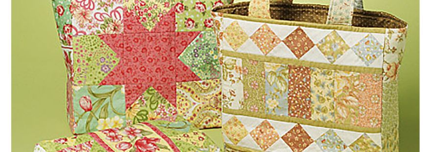 Shaped like a classic shopping tote, this 13″ x 13″ bag is large and roomy with comfortable, elbow length straps. Unlike most totes which are quick projects, this is not the fastest or easiest bag to make. I have made two of the three bags pictured several times. It is not a difficult bag but it is time-consuming. It requires careful cutting and piecing of fabrics, just as if you were making a bed quilt. But take your time and piece your seams properly and you will love the results.