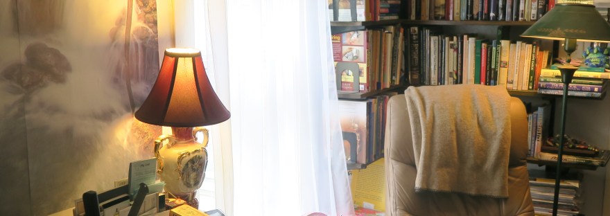 Once empty of art projects and supplies, the first floor room became the perfect spot for setting up a home office and library. It too is a small space and is separated from my living room by an open archway where we have installed a large glass window wall. I moved in the filing cabinet and office supplies. Shelves were already in place for storing many of our books. I laid down a leopard print rug that I’d recently purchased and moved in two leather chairs that I swiped from the living room (there were too many chairs in the living room anyway). Lamps also “stolen” from other rooms, completed two quiet reading corners. A drop leaf table will serve for stashing mail and paying bills until I can find a small desk that will fit the space.