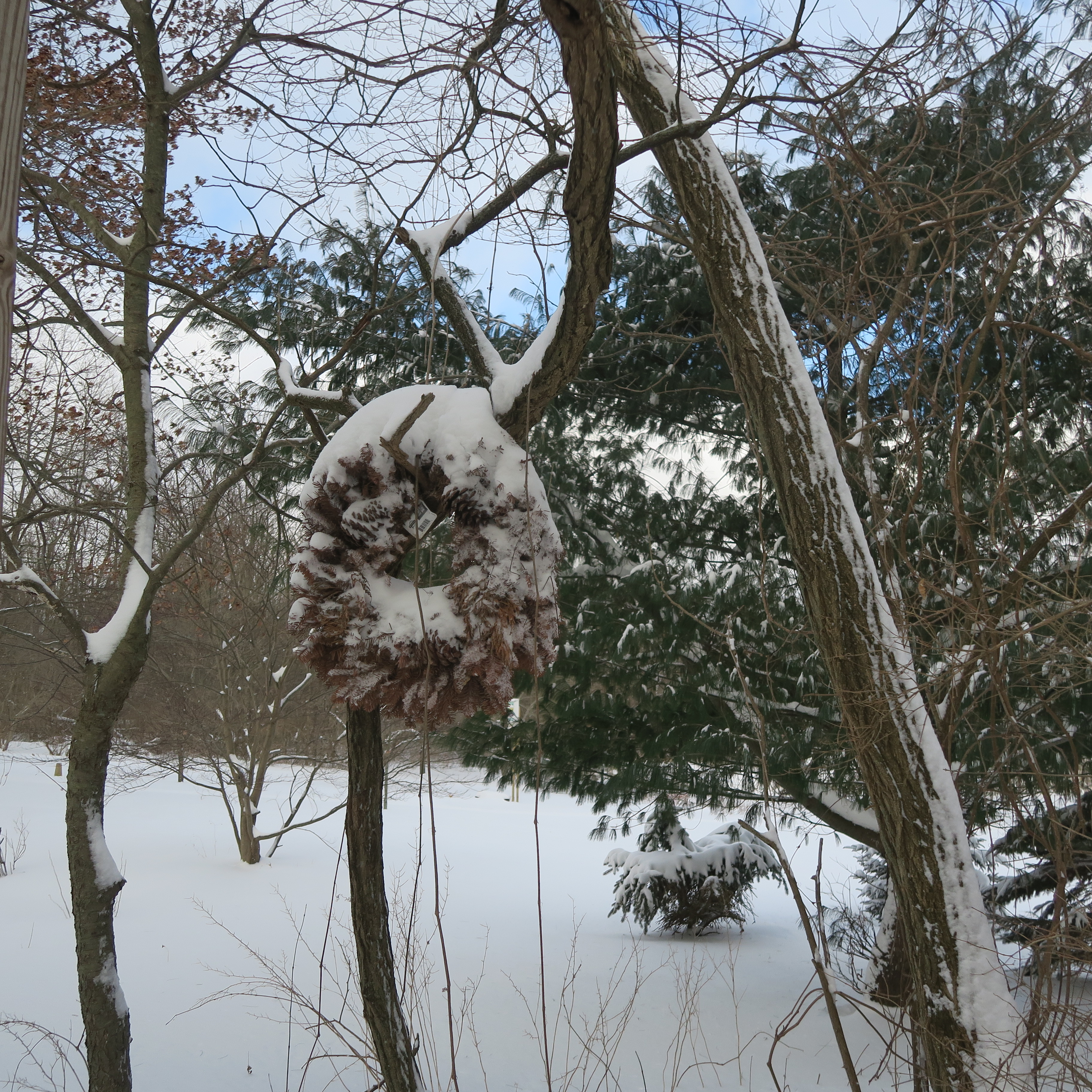 After Christmas I hang my wreath somewhere in the woods. In the springtime, birds often nest in them. This one is from two years ago.