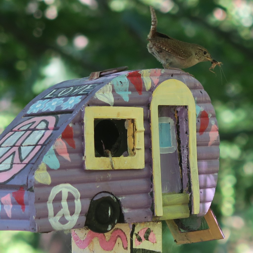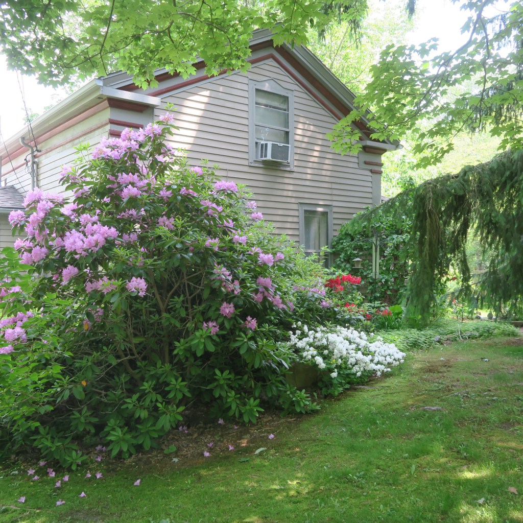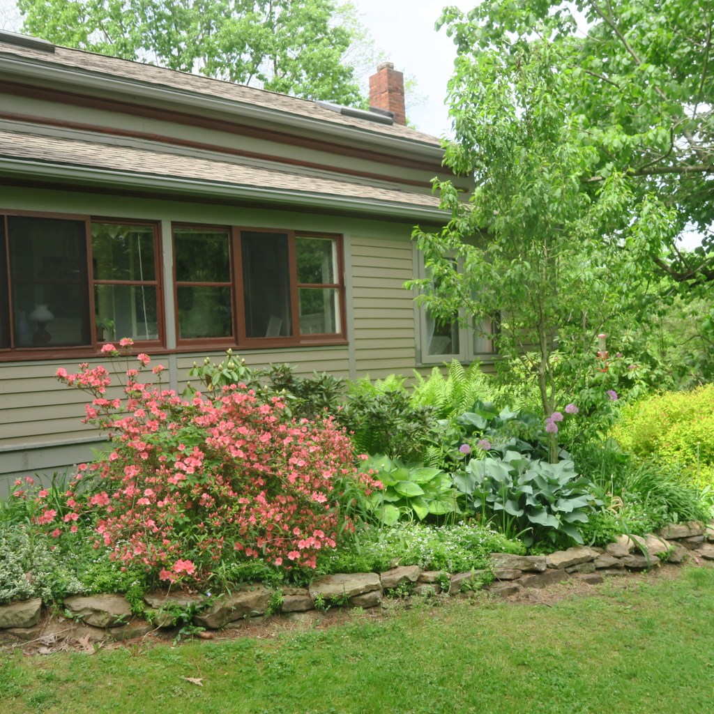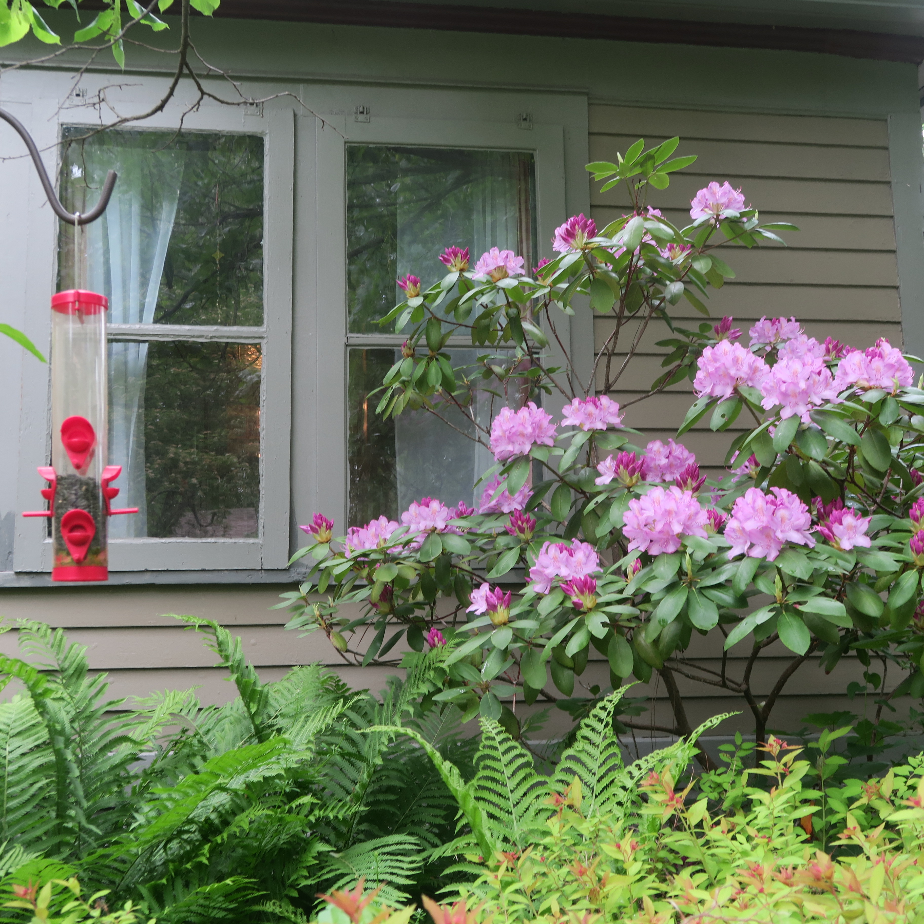 I began by removing high maintenance plants in the bed below my front porch windows. I replaced fussy flowers with large leaf hostas, tall, airy ferns and a ground cover of sweet woodruff. My husband added a few flowering shrubs — spirea, rhododendrons, and an azalea. He added a white flowering crab apple tree outside the dining room window. I finished off the bed with a couple low maintenance perrennial flowers and a metal trellis where I planted a twining clematis and hung a bird feeder.