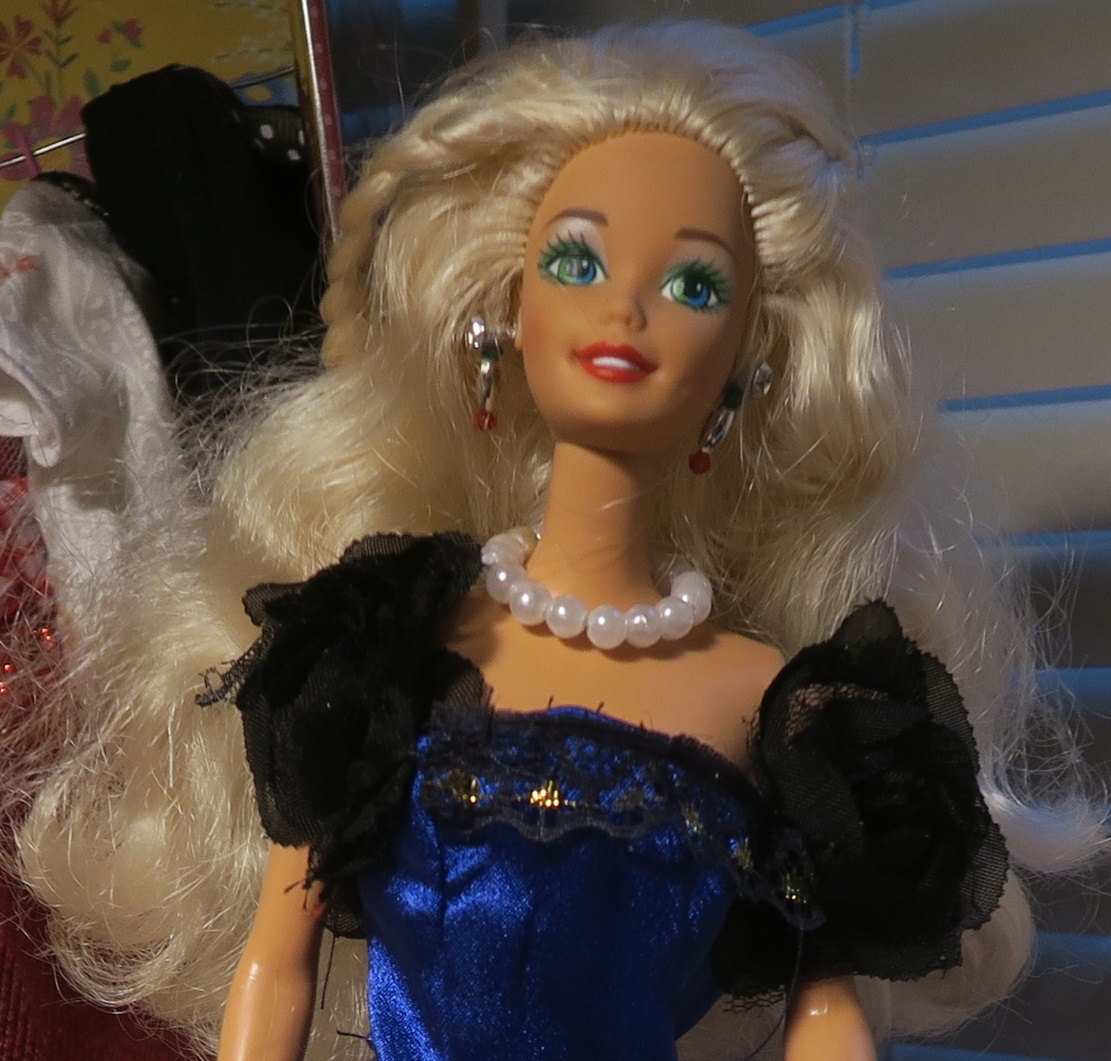 You might have to fuss a little if your dolls hair is damaged. My Barbie started out with hair that was somewhat frizzy. After combing out her dried curls, the frizz was still there. I ran her curls under a hot faucet – as hot as my faucet will get but not hot enough to remove the curls. I worked in a little fabric softener and gently combed it into the frizzy ends. Then I “scrunched” Barbies hair several times until the frizz was gone or at least no longer so noticable. I sat Barbie aside to once again air dry.
