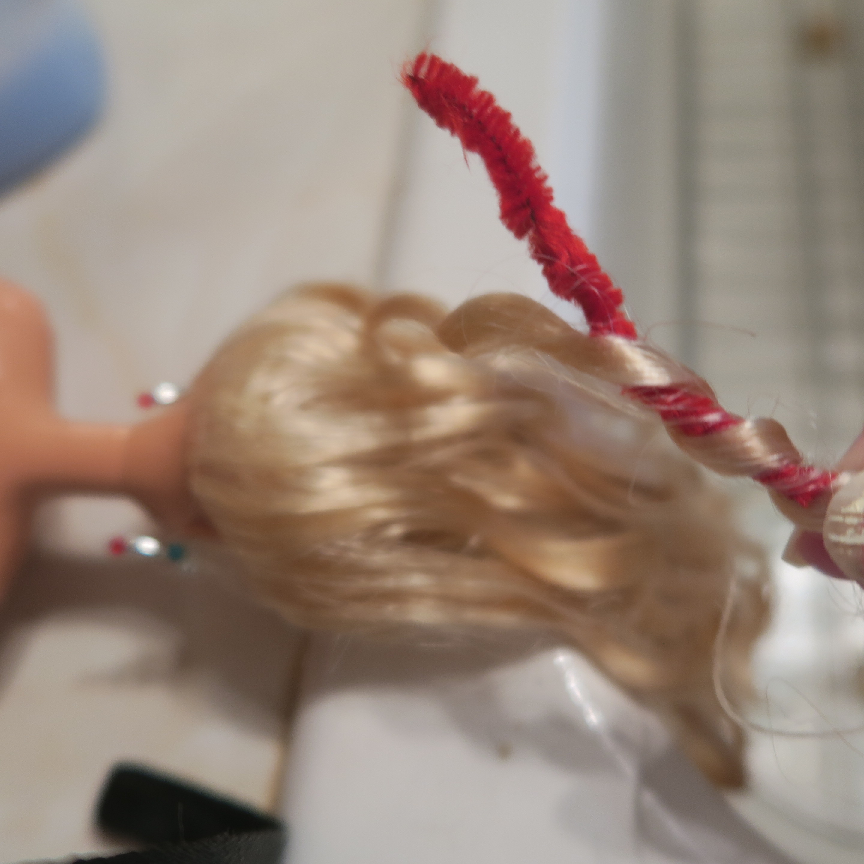 I used pipe cleaners to create hair rollers for Barbie. Others use plastic straws or twist ties. I carefully rolled Barbie’s wet hair into curls and pinched the pipe cleaner ends to hold the curls in place. The more curls you make, the fuller and tighter the curls will be.Be careful not to roll too tightly near her face. You probably want the hair around her face to remain smooth.