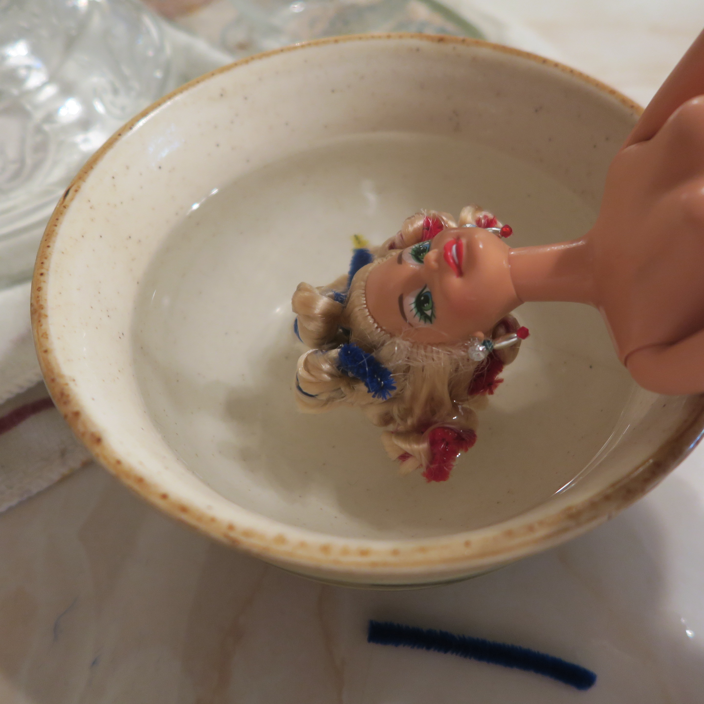 Carefully dip Barbie’s rolled hair into a bowl of boiling hot water. Hold it for 10 seconds and only 10 seconds. You don’t want her head to melt!